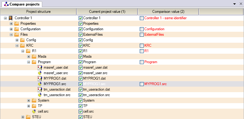 2. 選擇需與當前 WorkVisual 項目作比較的項目,例如實際機器人控制系統上的同名項目。