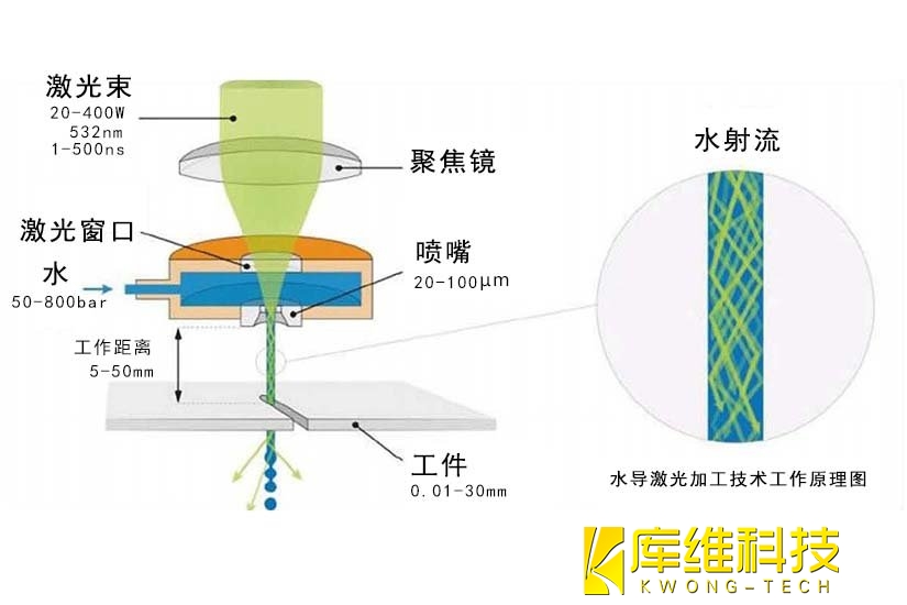 原理:利用激光通過壓力調制的水腔,將激光束聚焦在噴嘴上,形成光波導,從而引導激光切割。