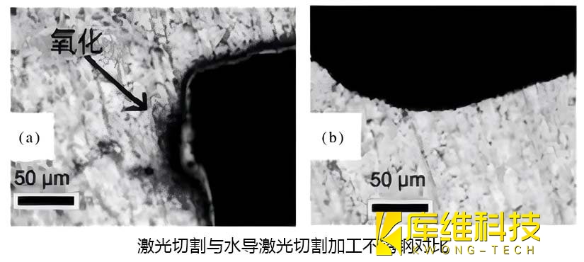 在金屬板材切割方面,用傳統(tǒng)激光與水導(dǎo)激光分別切割不同厚度的AISI1020鋼板,發(fā)現(xiàn)水導(dǎo)激光大大降低了材料表面粗糙度,并最大限度減少了與傳統(tǒng)激光切割相關(guān)的問(wèn)題,例如切口和熱損傷。同時(shí),與傳統(tǒng)激光切割相比,水導(dǎo)激光切割產(chǎn)生的白層更小,表面波紋也得到顯著改善。通過(guò)對(duì)比還發(fā)現(xiàn),在切割速度一致的情況下,水導(dǎo)激光切割在材料表面粗糙程度和內(nèi)部結(jié)構(gòu)熱影響區(qū)方面優(yōu)勢(shì)明顯,這一特性在不銹鋼切割對(duì)比中也得到充分驗(yàn)證。