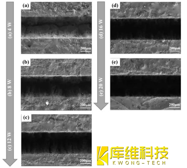 通過圖中不同激光功率下的水導(dǎo)激光對(duì)陶瓷材料切槽的 SEM 圖像,我們能夠更加直觀地觀察到加工效果的差異。激光功率的提升,會(huì)致使陶瓷材料表面的熔融區(qū)寬度以微米級(jí)的幅度遞增。而隨著掃描速度的增加,材料的燒蝕深度減小但燒蝕效率提高。水導(dǎo)激光切槽陶瓷材料的表面形貌相對(duì)較好。